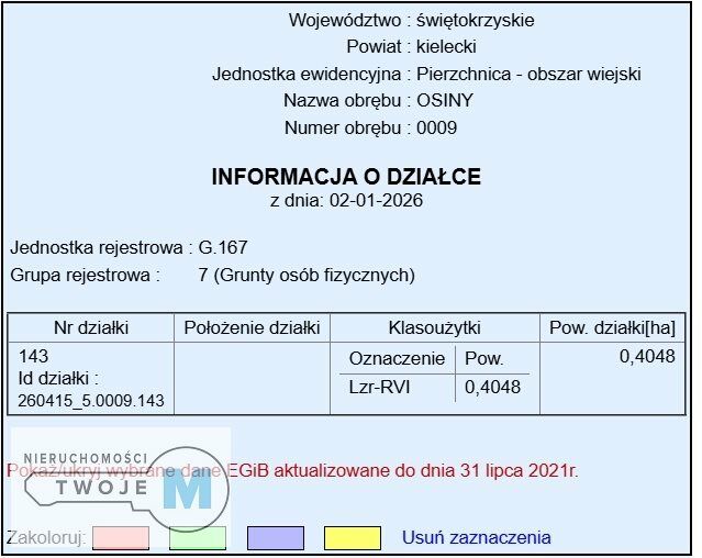 Niepowtarzalną nieruchomość gruntowa w miejscowości Osiny , gm. Pierzchnica, powiat kielecki. Działka rolna o nr 143 o powierzchni 0,4048 ha , położona przy drodze gruntowej, zlokalizowana przy działkach rolnych.