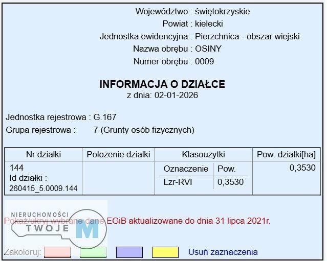 Do sprzedania również działka rolna o nr 144 o powierzchni 0,3530 ha .